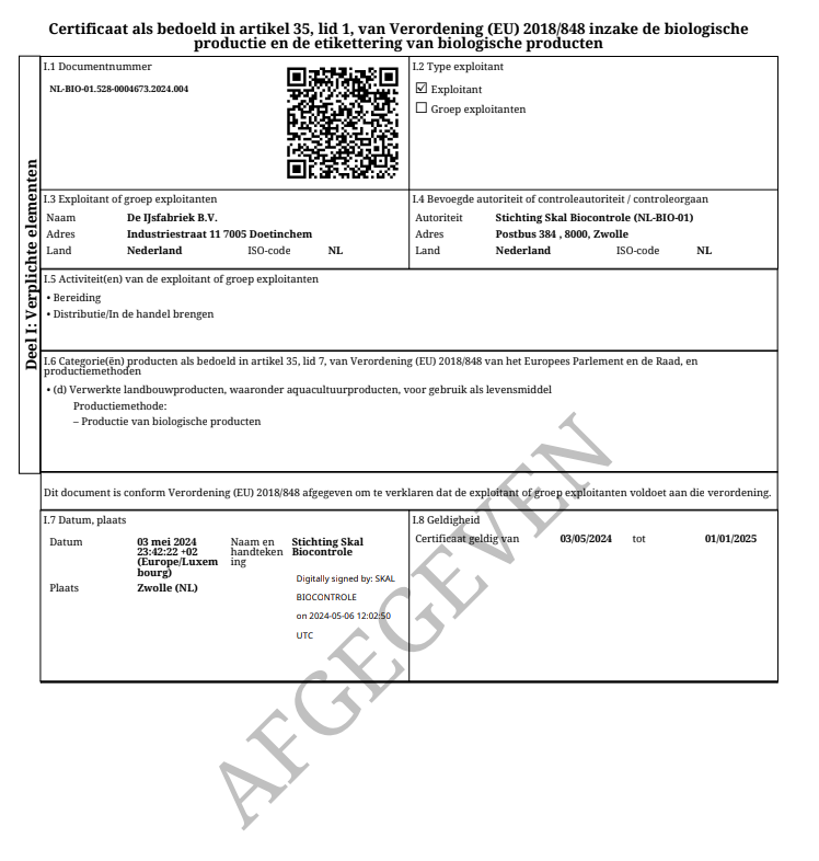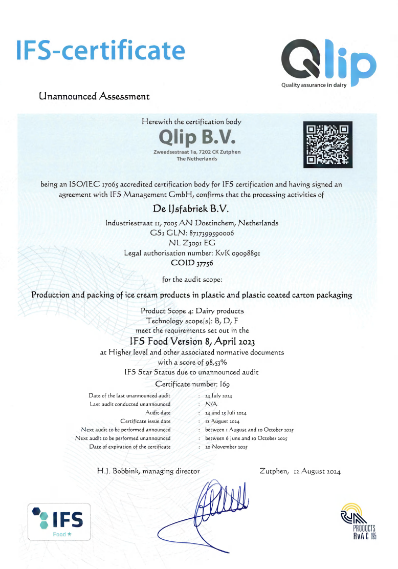 De IJsfabriek is IFS high-level en Skal gecertificeerd, staat onder toezicht van de NVWA, is lid van FNLI en NVC,